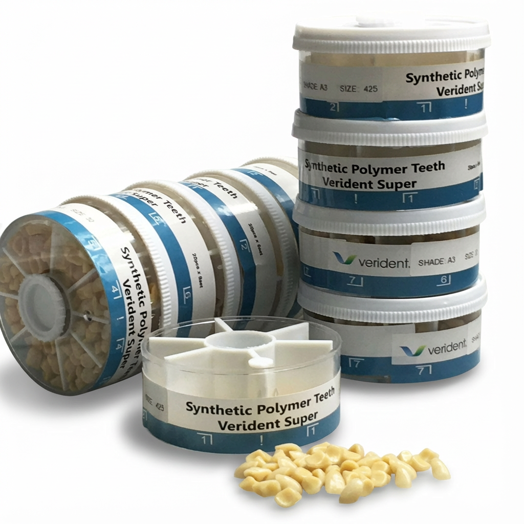 Зубы «Verident Synthetic Polymer Teeth» представляют полную имитацию естественных зубов. Удовлетворяют требованиям анатомической формы, как фронтальных так и окклюзионных поверхностей боковых зубов с учетом теории артикуляции. Жевательные поверхности поставляемых современных компонентов зубов сформированы таким образом, чтобы соответствовать требуемым артикуляционным движениям.