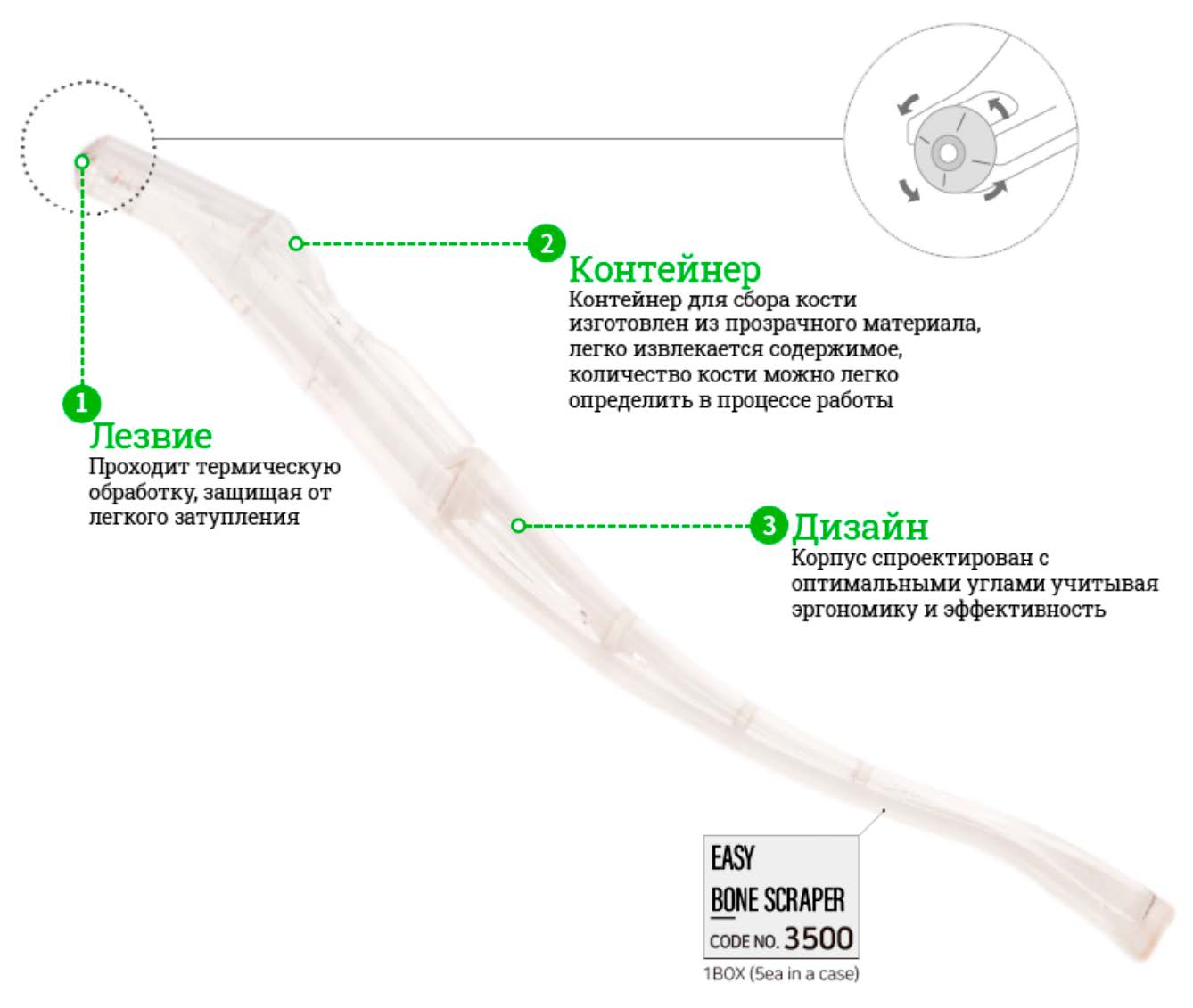 EASY BONE SCRAPER - Передняя часть согнута так, чтобы боковой доступ к полости рта был легким. Лезвие используется при повороте на 90°, а также при повороте на 360°. Поскольку продукт прозрачен, вы можете в реальном времени увидеть количество взятой аутогенной кости. Вместе с Easy Bone Scraper, вы получаете: атравматичный забор без повреждения донорской области, гарантированный доступ к удаленным донорским зонам, нулевую потерю аутокости при заборе, экономическую выгоду (поворотное лезвие + возможность автоклавировать).