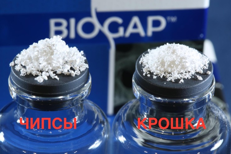 Биоимплант ГАП чипсы (размер частиц ~1.0-2.0мм) – это высокоочищенный минеральный матрикс кости с сохраненной природной архитектоникой, полученный в результате химической и термической обработки: 100%±0,01% природный гидроксиапатит.