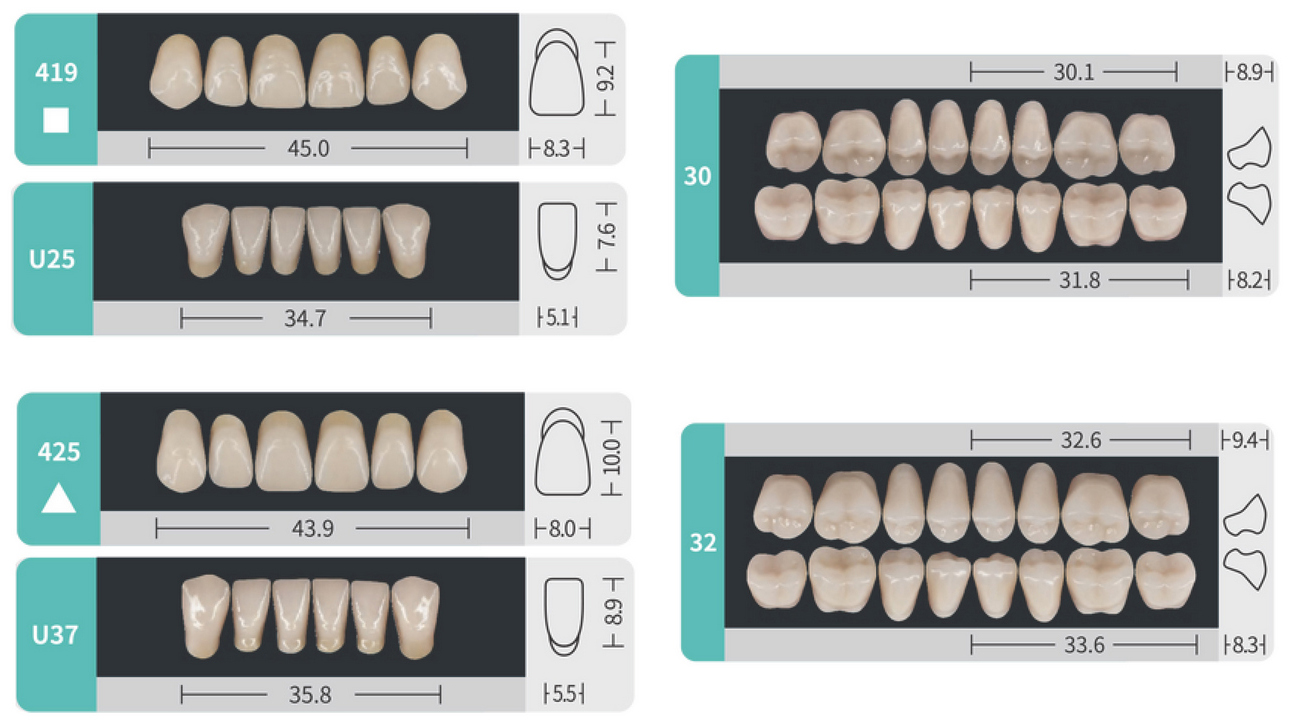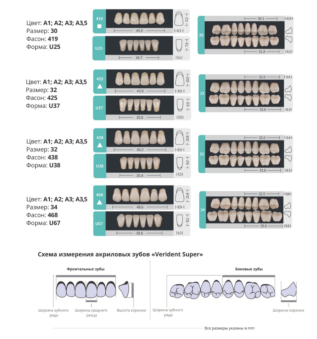 Зубы «Verident Synthetic Polymer Teeth» представляют полную имитацию естественных зубов. Удовлетворяют требованиям анатомической формы, как фронтальных так и окклюзионных поверхностей боковых зубов с учетом теории артикуляции. Жевательные поверхности поставляемых современных компонентов зубов сформированы таким образом, чтобы соответствовать требуемым артикуляционным движениям.