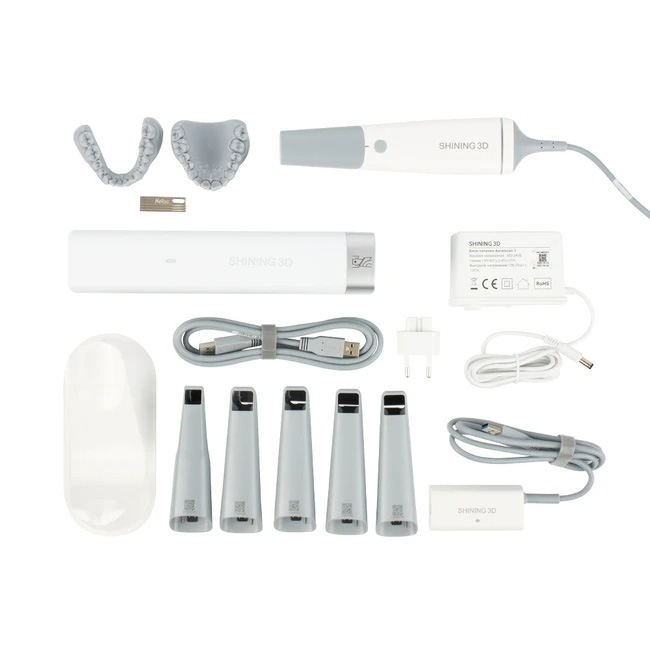 В комплекте поставляется два типа наконечников: стандартный и мини-наконечник. Это позволяет использовать сканер как для взрослых, так и для детей, адаптируясь к индивидуальным потребностям каждого пациента.